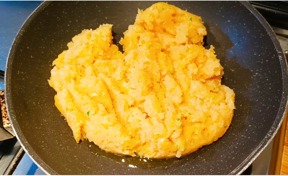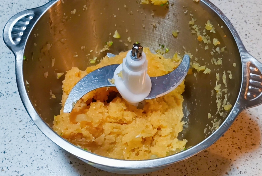 Cuando hayan cocido las verduras y la pechuga de pollo, viértanlas en un recipiente y añadan los demás ingredientes, la fontina, el parmesano, la cúrcuma, el huevo, la sal y la pimienta