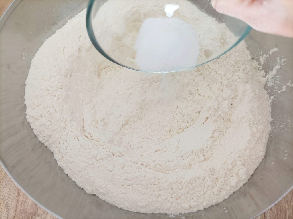 En un contenedor poned la harina y la levadura, mezclad bien y añadid la sal y el agua en dos veces.