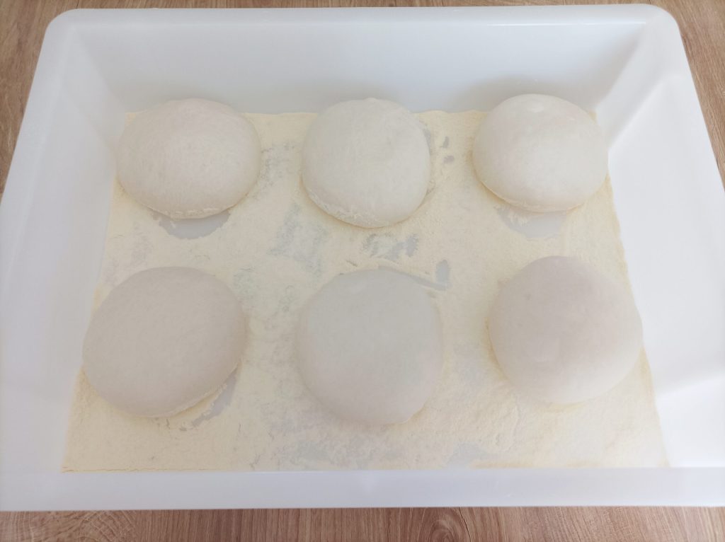 La masa en este punto ha madurado, así que proceded con el cortado. Cortad bollos de 250 g y ponedlos en un contenedor con harina o sémola, un poco separados entre sí.