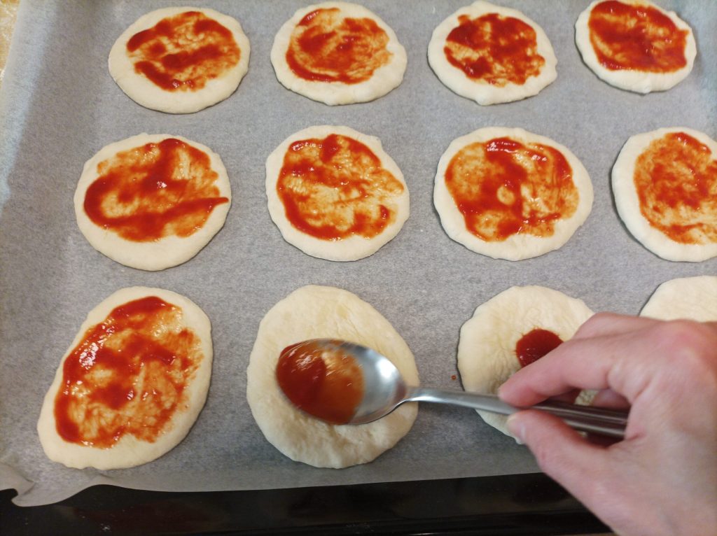 Ahora podemos preparar las pizzetas. Toma una bolita y aplástala con los dedos, prepara la bandeja con papel para horno y colócalas encima.