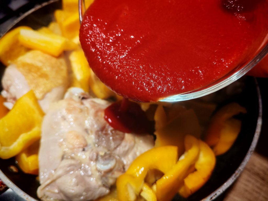 Después de unos dos minutos, baja el fuego y agrega los pimientos, el puré de tomate, el caldo, las aceitunas y un poco de sal.