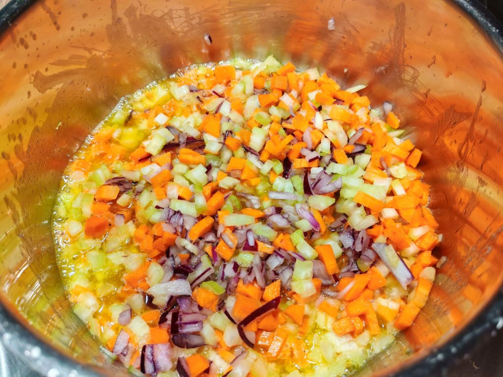 Limpia las verduras y córtalas en trocitos. En la cacerola, pon el aceite y la mantequilla y caliéntalos bien.