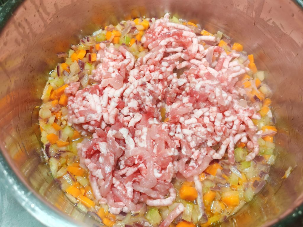 El ragú después de 2 horas. En este momento, añade la leche poco a poco y siempre a fuego lento, cocina durante una hora más, prestando atención a que no se seque demasiado. Al final de la cocción, añade sal y pimienta.