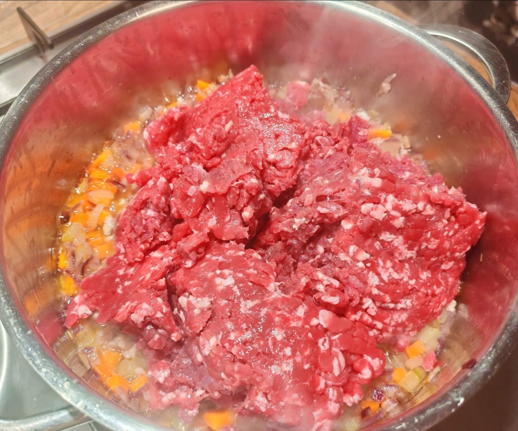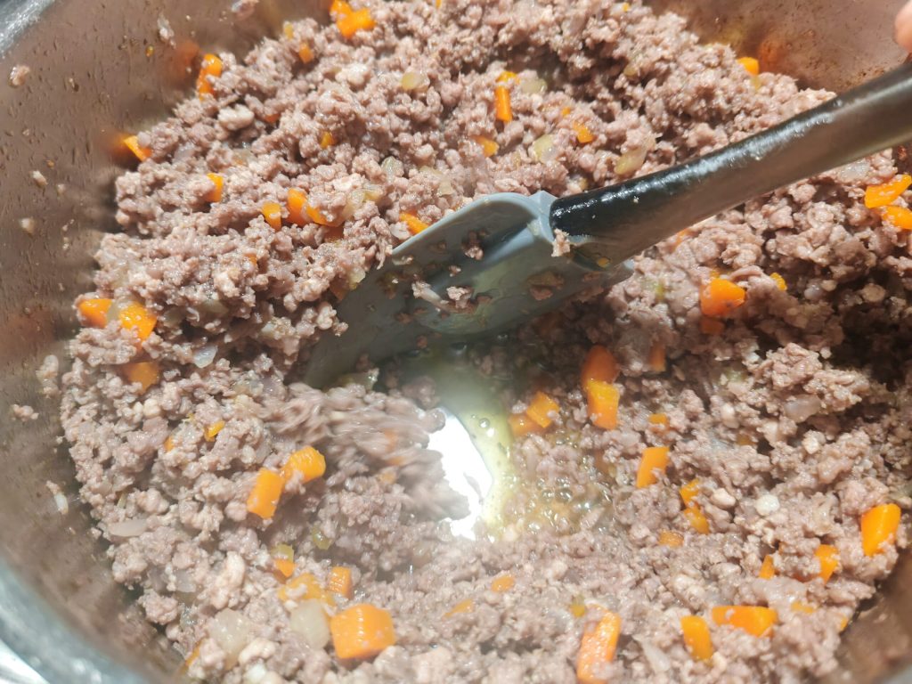 Después, puedes añadir también la carne picada de res, que soltará toda el agua, así que cocínala a fuego moderado hasta que esté bien seca en el fondo.