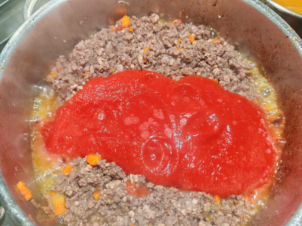 Después de que el vino se haya evaporado, añade el puré de tomate y el caldo, cubre y cocina durante unas dos horas a fuego lento; si se seca demasiado, añade un poco de caldo.