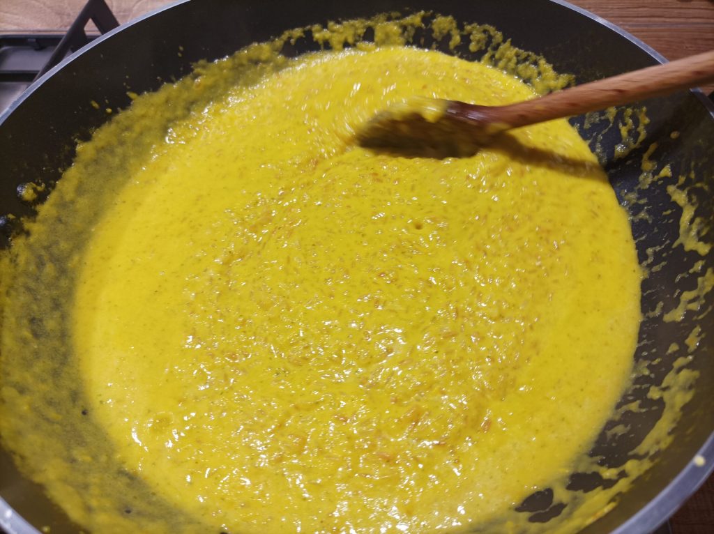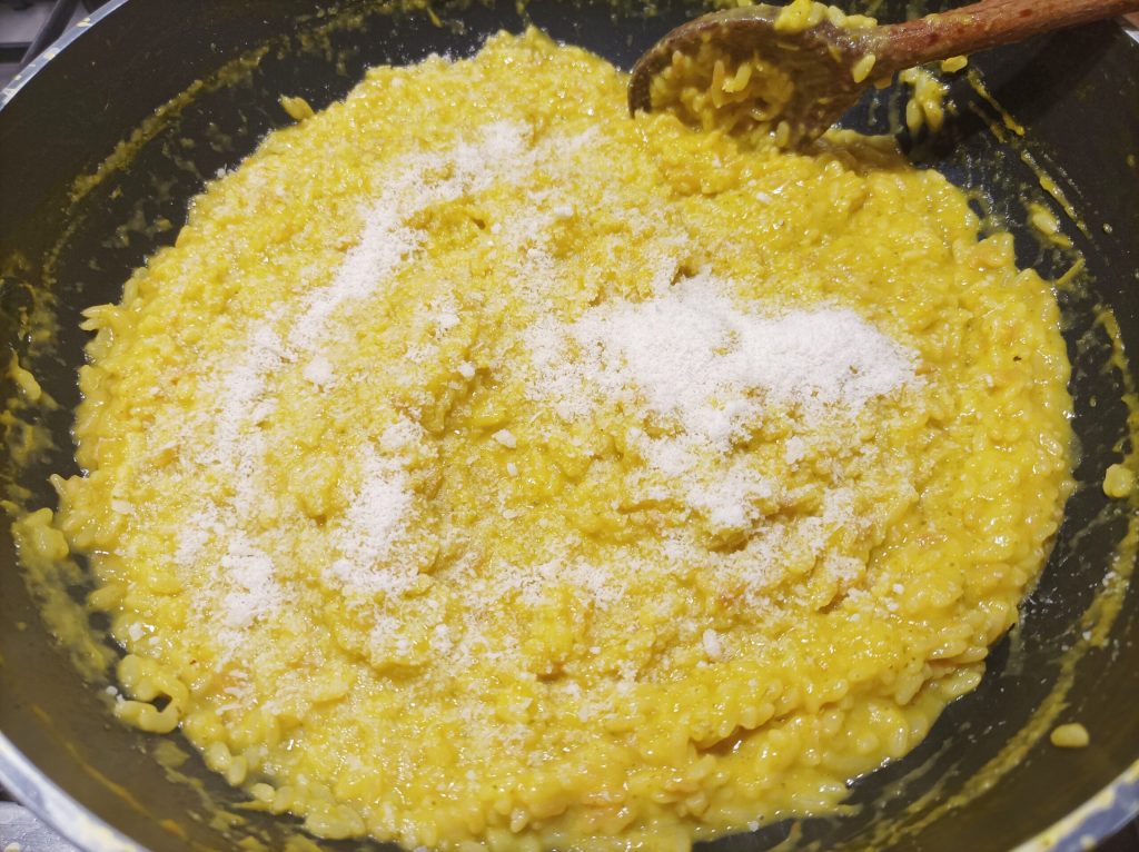 Añade otros 2 cucharones de caldo y lleva a cocción añadiendo caldo cuando sea necesario. Después de unos 15/18 minutos (ajústese al tiempo de cocción del arroz utilizado) añade la mantequilla y el parmesano, mezcla bien todo y apaga.