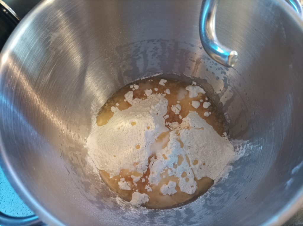 Coloca en el bol de una batidora de pie, agua, azúcar, miel y levadura, deja que se disuelva.