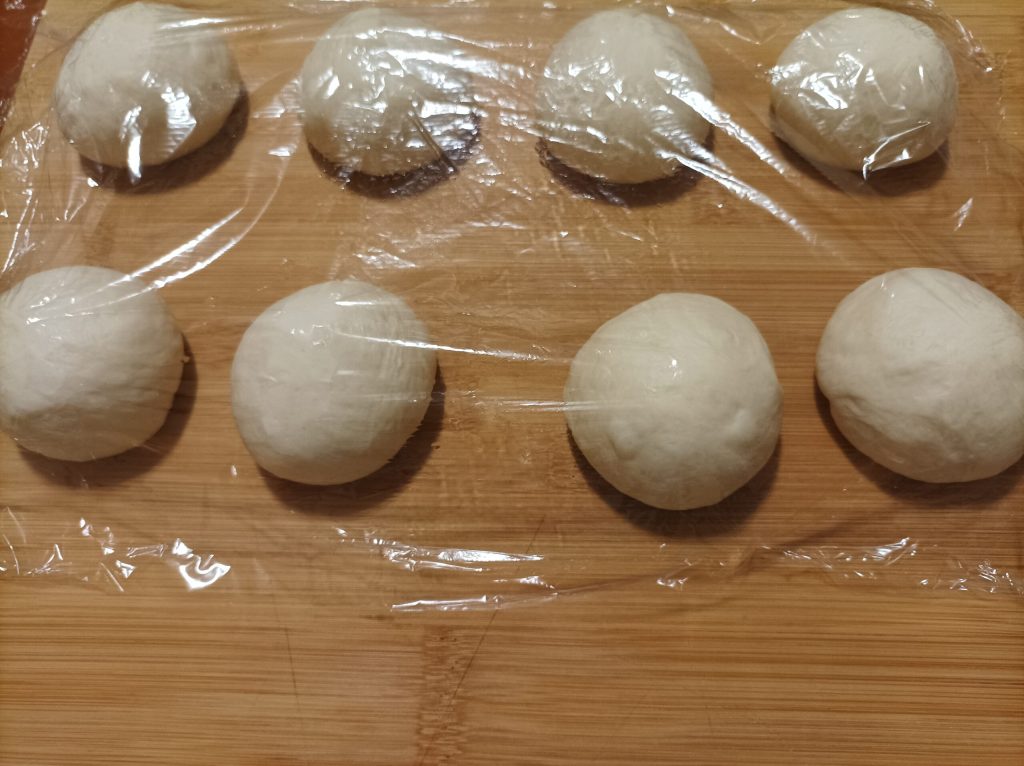 Pasadas las horas de levado, toma la masa y divídela en dos. Forma un cilindro y corta porciones; puedes decidir si hacerlas pequeñas, tipo buffet, de 50 g, o más grandes de 80/90 g, o incluso de 120 g.