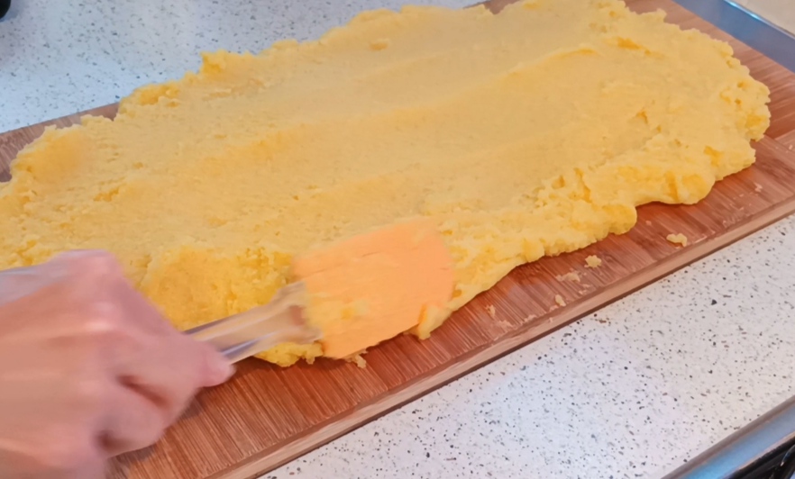 Vierte la polenta sobre una tabla de cortar y aplánala con una espátula.