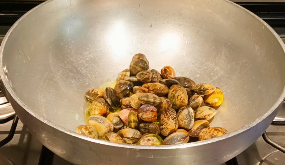 Cuando el aceite esté bastante caliente, verted las almejas. Mantened el fuego moderado y dejad que se abran las almejas.