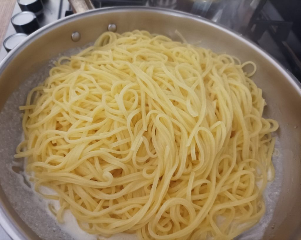 Mientras tanto, cocina los tagliolini en agua con sal, en 2 minutos estarán cocidos. Escúrrelos y reserva un poco de agua de cocción.