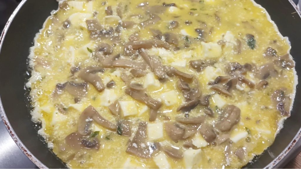 Ahora procede con los huevos, ábrelos y bátelos bien, luego añades el pecorino/parmesano, sal y pimienta sin exagerar, recuerda que los champiñones ya están sazonados, mezcla bien y pon la mozzarella cortada en dados.