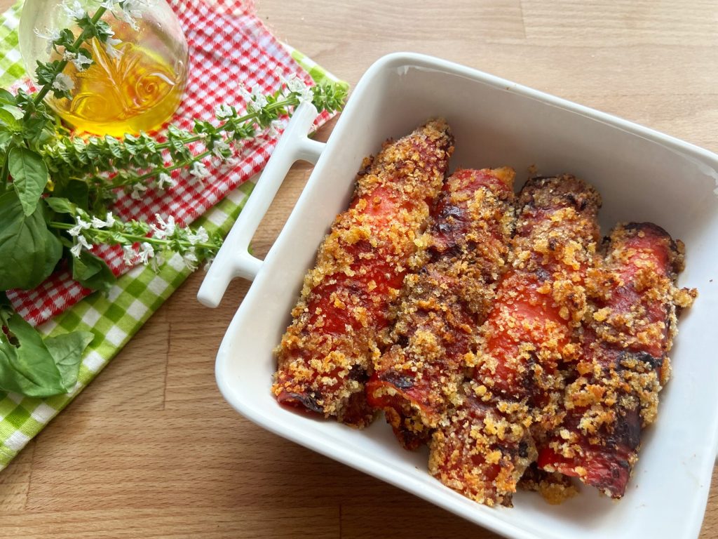 Los rollitos de pimientos a la siciliana al horno son un plato rico en sabores mediterráneos, perfecto para quienes aman las recetas simples pero sabrosas. Elaborados con pimientos asados y rellenos con un sabroso relleno de pan duro, aceitunas, alcaparras, pasas y tomates secos, estos rollitos son ideales como aperitivo o acompañamiento, además son vegetarianos. Fáciles de preparar e irresistibles, traen a la mesa todo el sabor auténtico de Sicilia.