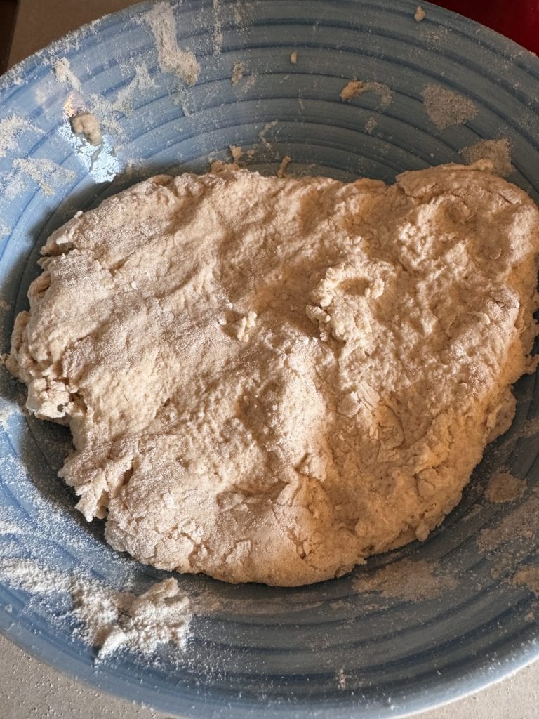 • Preparar la autólisis: en el cuenco de las harinas agregar 120 g del agua total, crear un panecillo y dejar reposar durante aproximadamente media hora. Al ser la masa hecha principalmente de harinas débiles, este paso permitirá desarrollar mejor la red de gluten.
