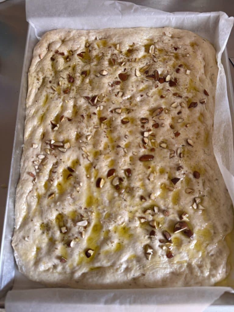 • Una vez que está bien extendida, rociarla con más aceite Olitar y encender el horno a 220 grados. Cuando el horno esté a temperatura, antes de hornearla, espolvorear la focaccia para el aperitivo etrusco con las almendras y sal. Si fuera necesario, agregar más aceite
