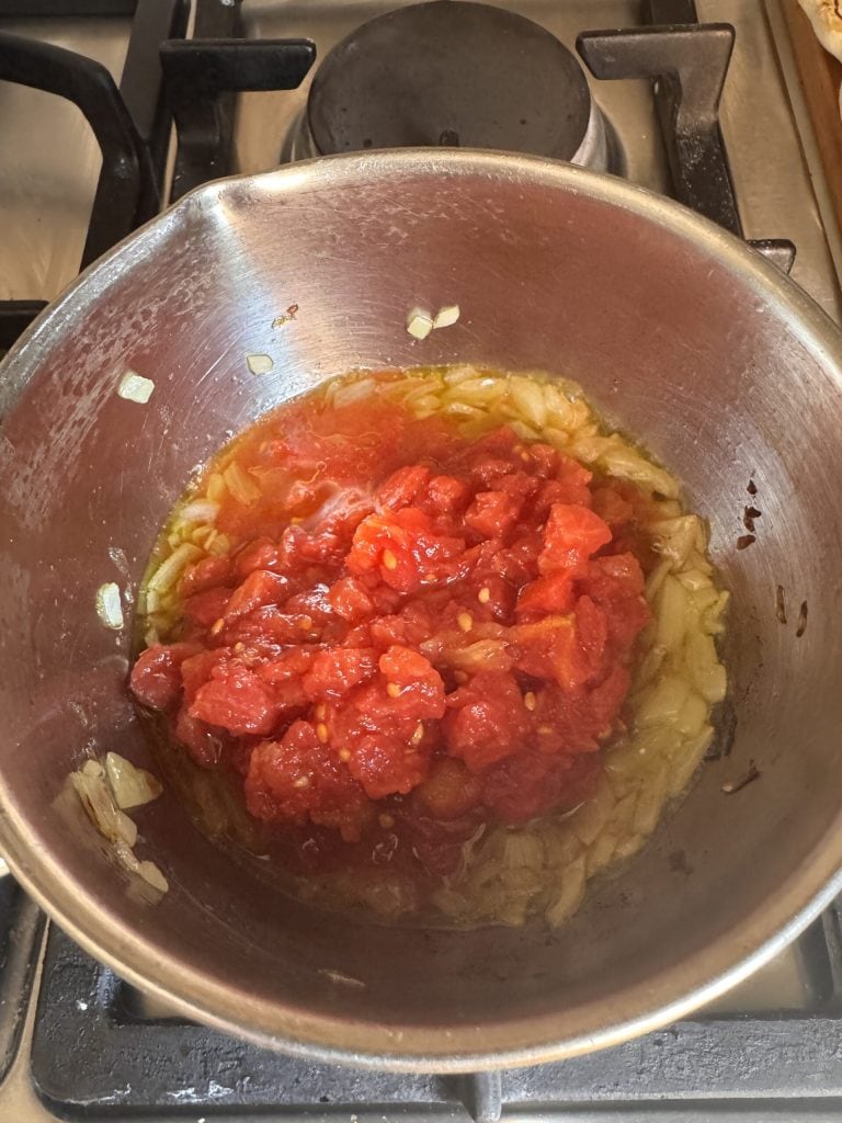 • Agregar la salsa de tomate al ajo dorado y cocinar durante 5/7 minutos.