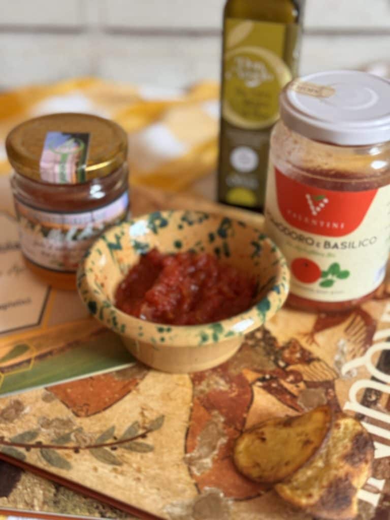 • Esta salsa de acompañamiento nació de un experimento: unir dos sabores aparentemente lejanos como el tomate y la miel para realzar una focaccia rústica y crujiente, como la habrían comido los Etruscos.