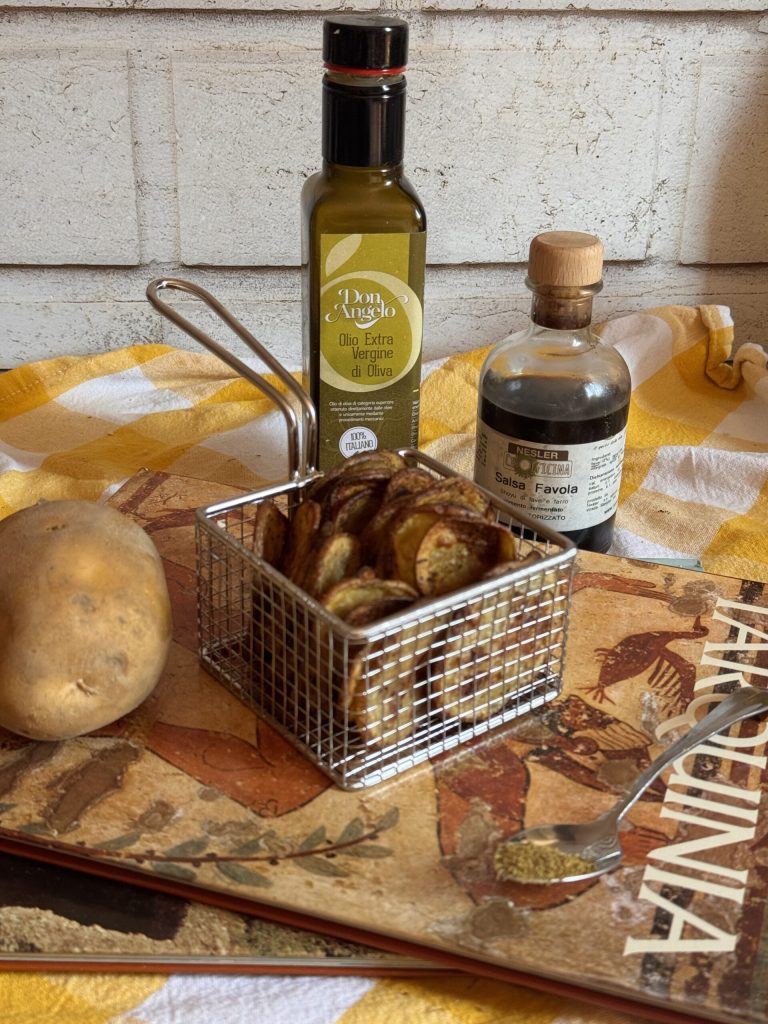 • Las patatas aromatizadas están listas para formar parte del aperitivo etrusco. He aromatizado las patatas de la cooperativa agrícola de Tarquinia con un fermentado de habas y espelta, realizado como una salsa de soja pero con ingredientes autóctonos, habas y espelta, de parte de la empresa Nesler que la produce reduciendo al mínimo los desechos, sin OGM y afinándola en barricas de madera. El aceite Olitar y el hinojo concluyen esta sabrosa preparación.