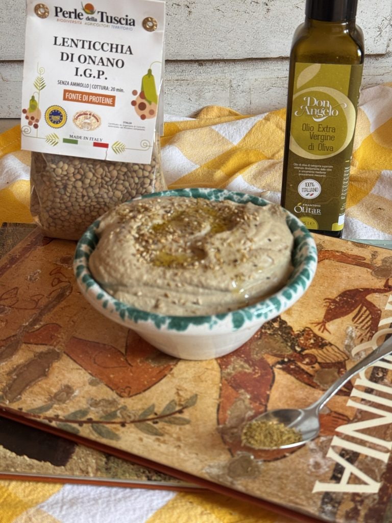 • La última preparación para este aperitivo etrusco es el hummus con las lentejas de Onano de Perlas de la Tuscia. Son lentejas que no requieren remojo, basta con enjuagarlas bien bajo el agua y hervirlas con una pizca de sal.