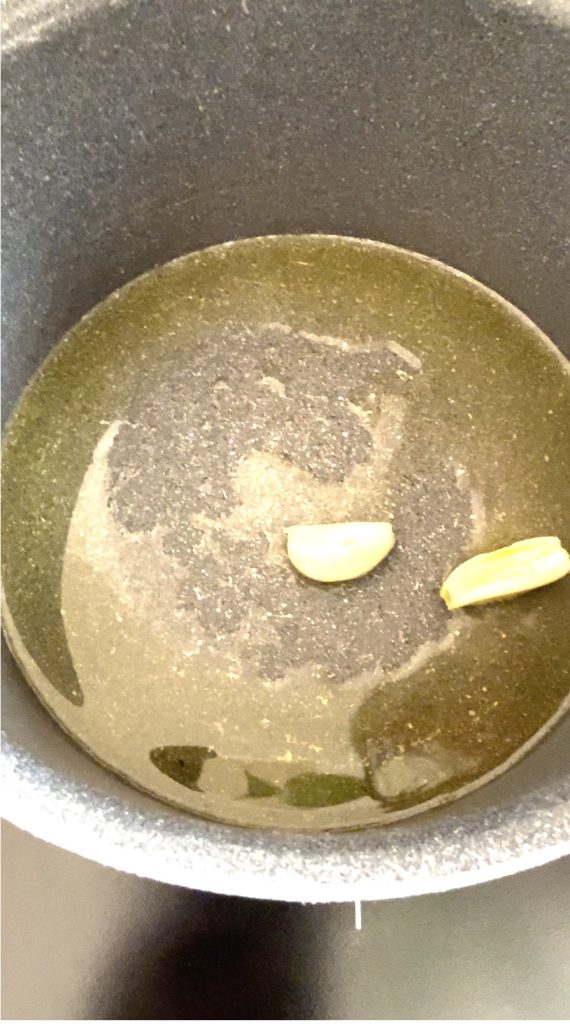 En un cazo, vierte el aceite de oliva virgen extra (AOVE) y caliéntalo a fuego medio. Cuando esté caliente, añade el diente de ajo pelado y dóralo cuidando que no se queme.