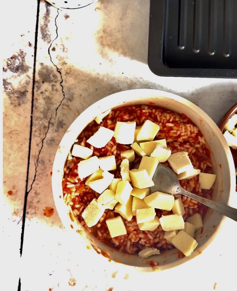 Corta el provolone en taquitos y repártelo por la superficie del arroz. Espolvorea con queso pecorino rallado y pan rallado para conseguir un efecto crujiente. Para un resultado aún más sabroso, puedes añadir algunos pequeños trozos de mantequilla en la superficie.