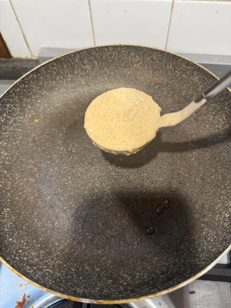 Cuando la sartén esté bien caliente, vierte un chorrito de aceite de semillas y distribúyelo uniformemente con un papel absorbente, para engrasar bien la superficie. Luego vierte al centro de la sartén una cucharada de masa y deja que se extienda delicadamente. Yo prefiero hacer crepes de calabaza pequeñas y compactas, así que utilizo poca mezcla por vez, pero puedes ajustar la cantidad según tus gustos.