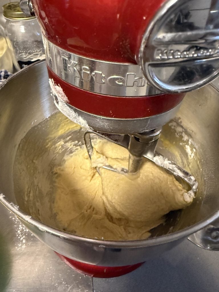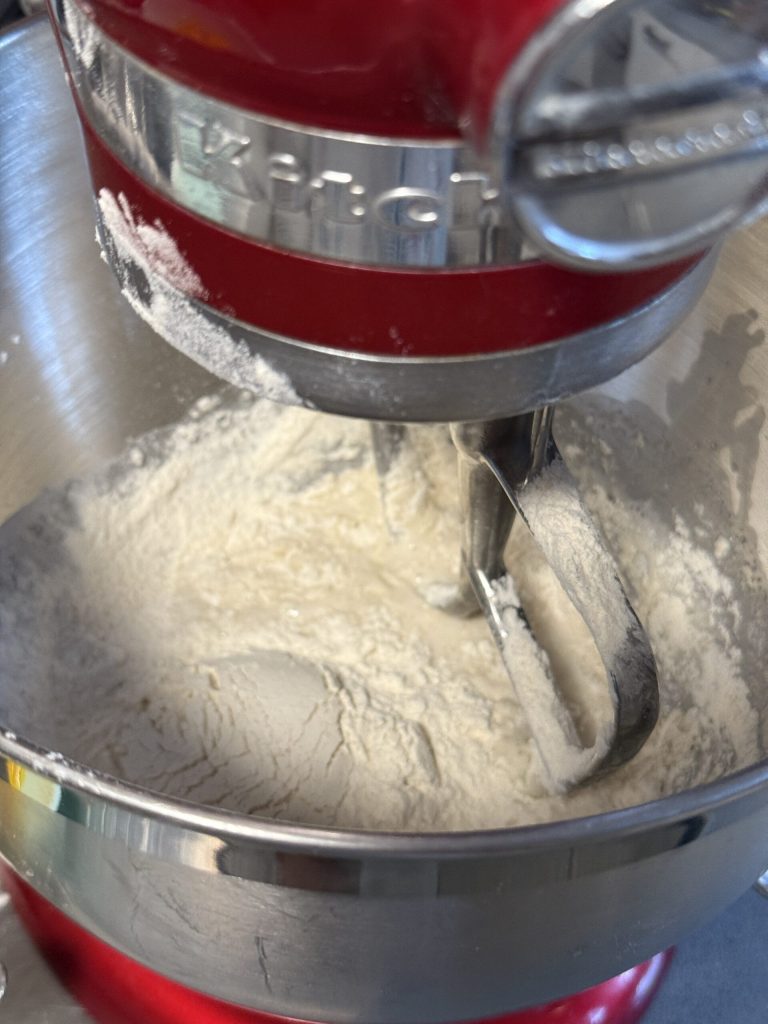 • Cortar la levadura madre en la amasadora y agregar 120 g de líquidos previamente mezclados y el azúcar.