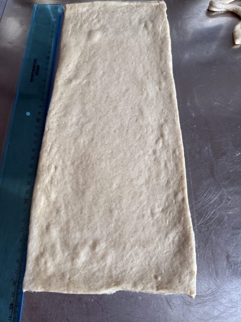 • Tomar la primera pieza y extenderla con el rodillo en una tira larga.