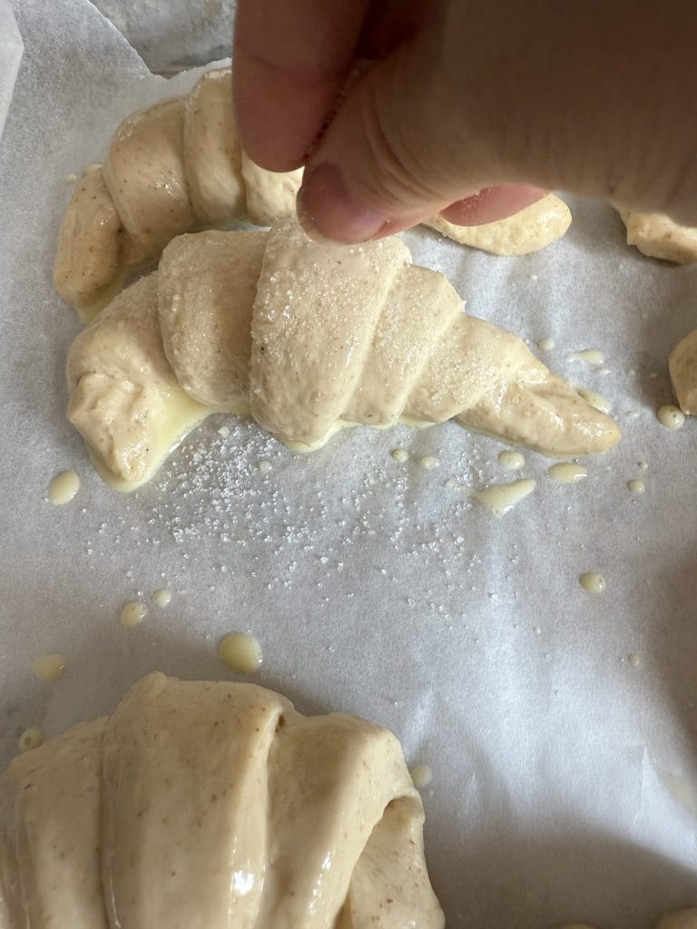 La receta de los croissants de pan hasta aquí descrita es muy neutra y su aroma se debe principalmente a la vainillina y al poco azúcar en la superficie, ya que los concebí para una alimentación controlada. Pero eso no quita que se puedan modificar para hacerlos más deliciosos. Podemos agregar 20 g de aceite de semillas, sustituir el agua por la misma cantidad de bebida vegetal y aumentar el azúcar hasta 40 g. En la superficie podemos poner más azúcar… y obviamente rellenarlos con mermelada.