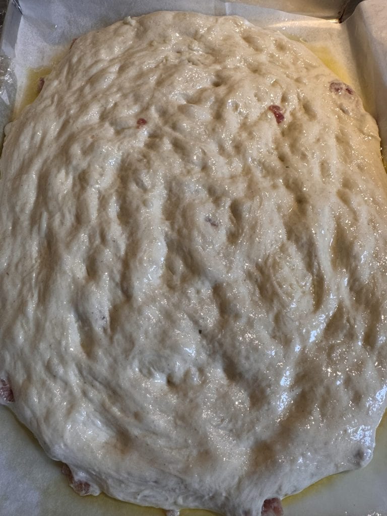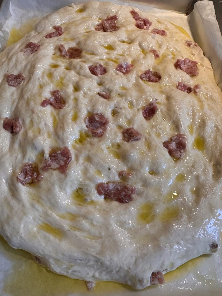 La focaccia con pecorino y salchicha es un resumen de los aromas y sabores de mi tierra, la Toscana. Es una focaccia con poca sal pero con pecorino toscano DOP y salchicha fresca, dos de los ingredientes más deliciosos que existen. Perfecta para una merienda, para servir en la cena o en un aperitivo, también es perfecta en un buffet, quizás acompañada de alguna salsa como el pesto de calabacín. Para realizar esta focaccia «traicioné» a mi masa madre para usar una masa madre seca de excelente calidad, el Fragranzasol del Molino Colombo, el único que me convence a dejar mi masa madre. Obviamente se puede sustituir con la masa madre y las dosis se encuentran al final de la receta. Si te apetece probar un poco de Toscana, ¡enciende la amasadora y vamos a amasar!