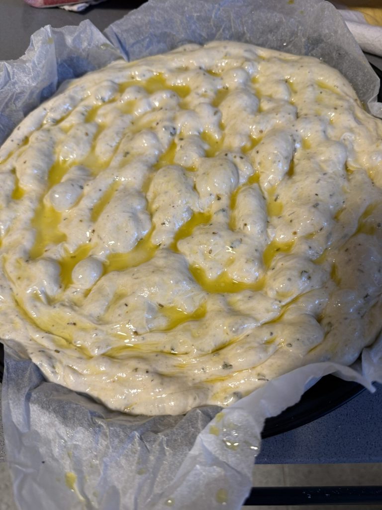 Cuando la masa esté bien extendida por toda la bandeja, hunde los dedos con decisión para crear los típicos huecos de la focaccia. Cubre con film transparente y deja que haga una segunda fermentación breve; mientras tanto enciende el horno y llévalo a 210°C en modo estático para que se caliente bien antes de hornear.