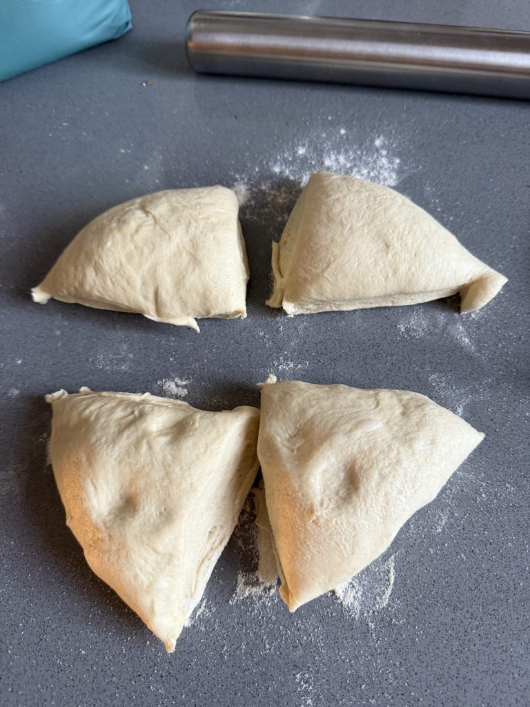 Evita desinflar demasiado la masa: trátala con delicadeza para no perder el aire acumulado durante la fermentación.Con la ayuda de un raspador o de un cuchillo de hoja lisa, divide la masa en 4 partes iguales. Si prefieres, puedes pesarlas para tener hogazas más regulares, pero también a ojo está bien: la Kesra con masa madre es una preparación rústica y casera, y un poco de irregularidad forma parte de su encanto.