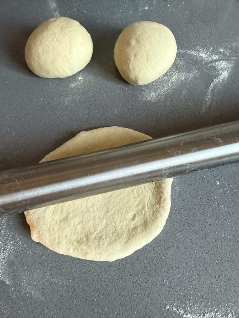 Toma una porción de masa a la vez y forma una bola lisa enrollando las porciones en la superficie un par de veces. Con la ayuda de un rodillo, comienza a extenderla cuidadosamente sobre una superficie enharinada.