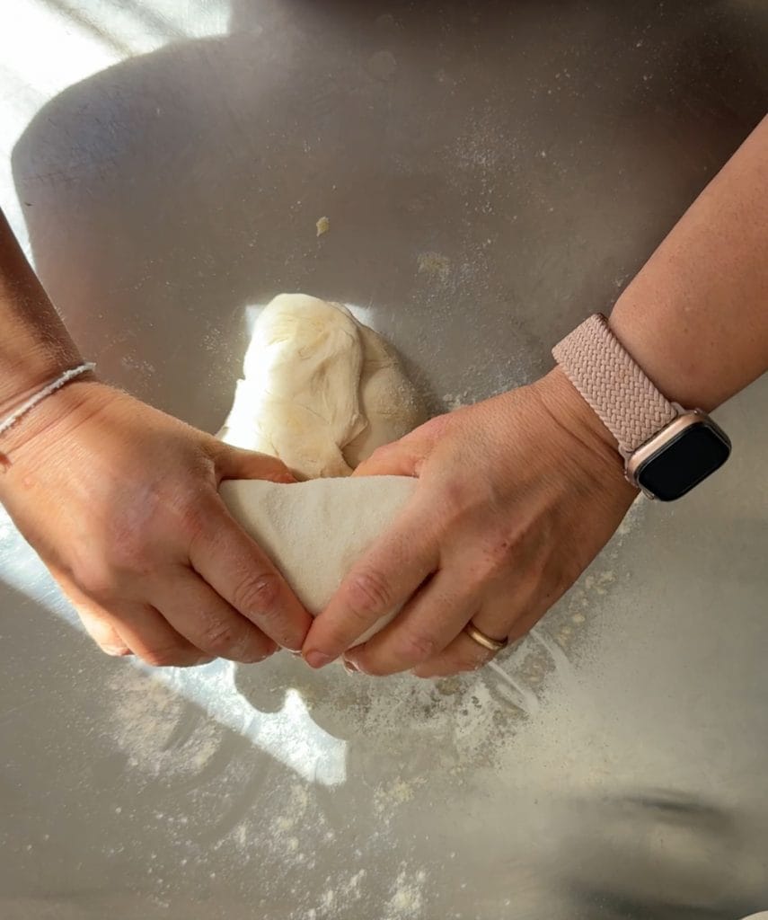 Una vez sellados todos los bordes, enrollad la masa sobre sí misma para formar una hogaza. Aseguraos de sellar bien la masa, para evitar defectos en la forma final de la hogaza.