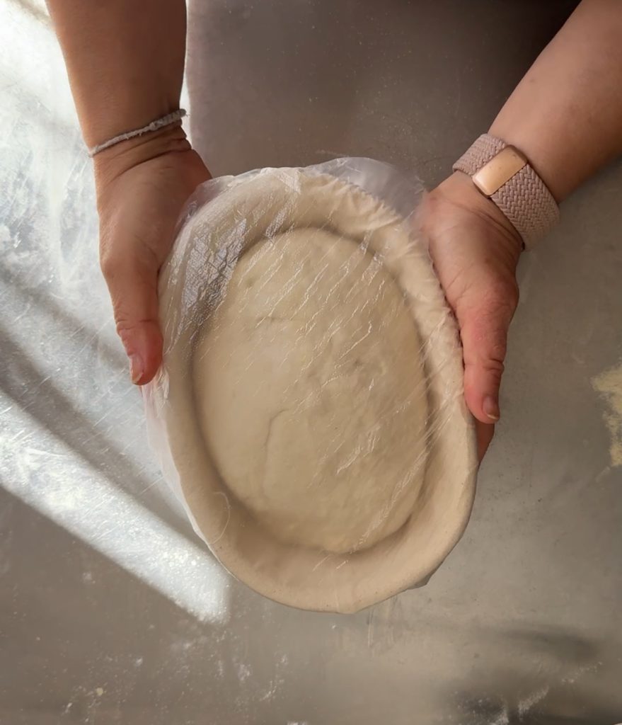 Cubrid el cesto con film plástico, una tapa de silicona o una bolsa para alimentos, así la masa tendrá el ambiente ideal para leudar. Mi pan, en verano, casi duplica su tamaño en una hora y media.