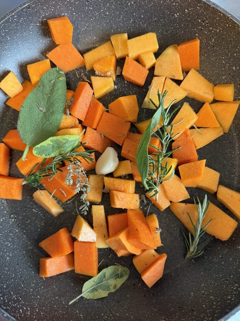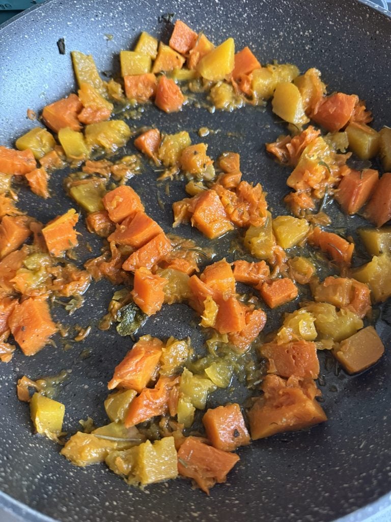 Una vez cocida, déjala enfriar. Yo cocino la calabaza por la mañana y luego hago el pesto por la tarde.