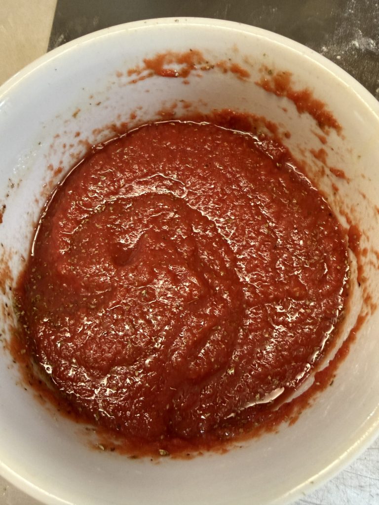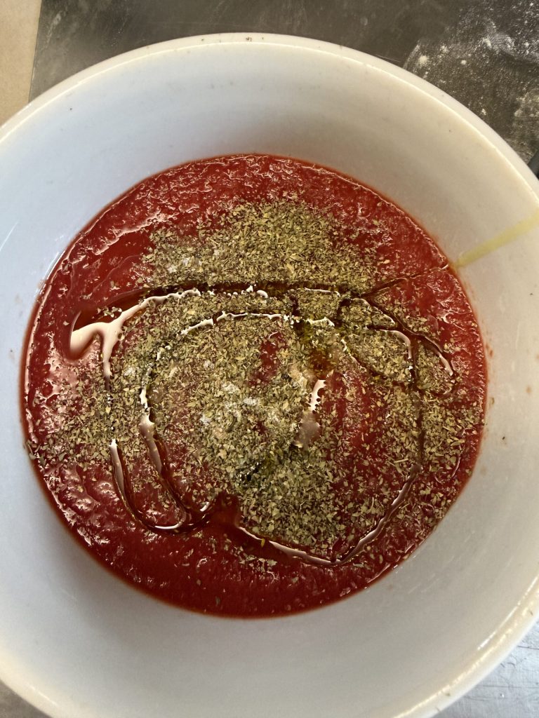 • Mientras la masa reposa, nos ocupamos del condimento. Para hacer todo más fácil y rápido, aprovechamos este “tiempo muerto” para prepararlo. Vierte el puré de tomate en un bol y prepara los ingredientes que usarás para sazonarlo y personalizarlo a tu gusto.