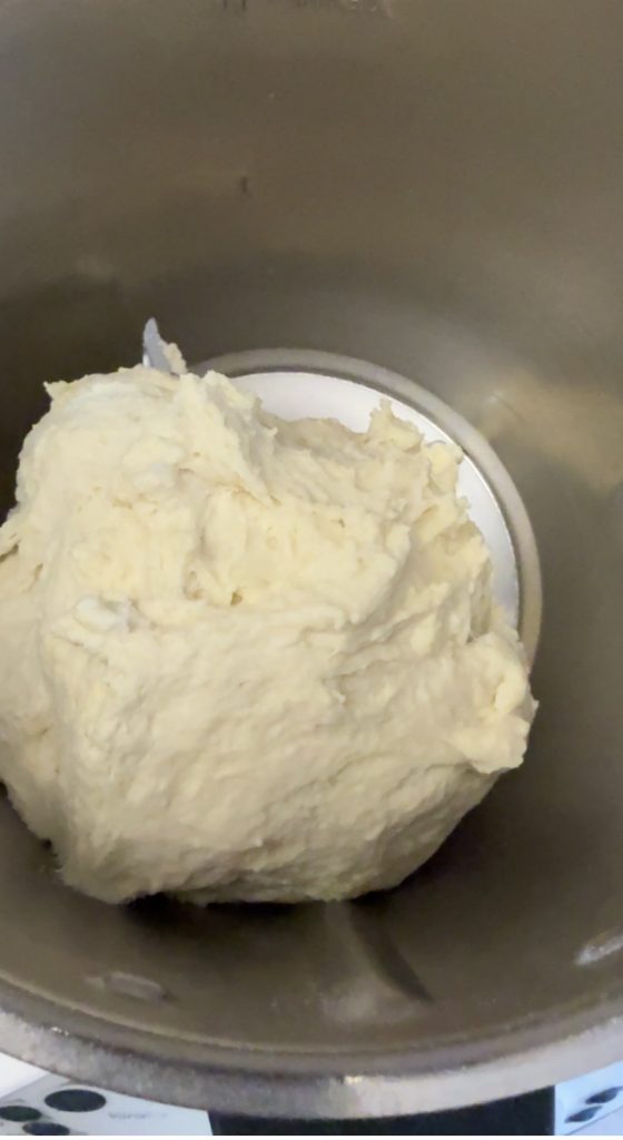 • Transfiere la harina al robot de cocina (yo usé el Bimby) o a un bol grande. Añade casi toda el agua y deja que la absorba la masa (en el Bimby modo espiga por un par de minutos). Cuando el agua esté bien absorbida, añade el resto y sigue trabajando hasta obtener una masa suave y homogénea.