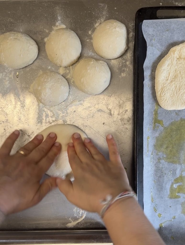• Toma cada porción de masa y pliega sobre sí misma para formar bolitas, luego pirla suavemente. Recomiendo prepararlas todas antes y luego pirlarlas nuevamente, comenzando desde la primera realizada: esto ayuda a dar mayor tensión y cohesión a las bolas, haciéndolas más fáciles de extender y más compactas en la cocción.