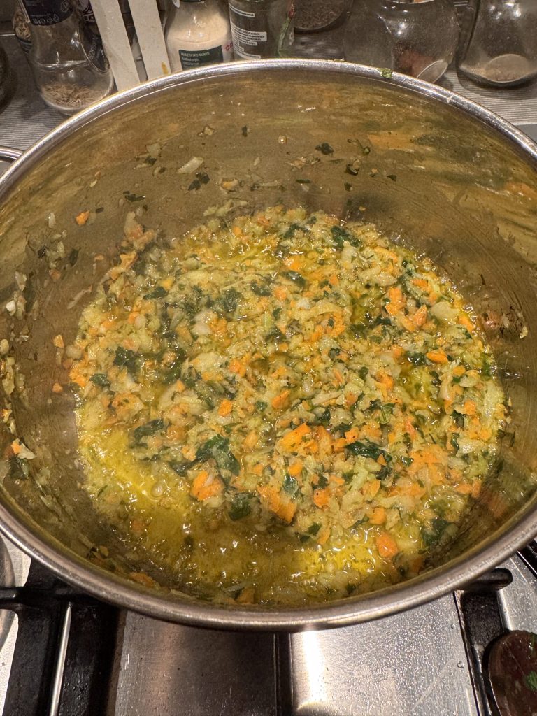 En una cacerola de acero alta y espaciosa verter una generosa cantidad de aceite con cebolla, zanahoria y apio ya picados. El apio debe ser siempre un poco más que la zanahoria.