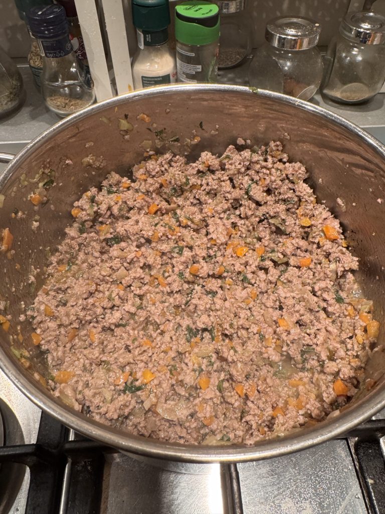 Siempre con la llama alta, añadir la carne picada de ternera y otro pellizco de sal y espolvoreada de pimienta. Aplastar la carne con el cucharón para que toda la carne se cocine y se mezcle con el sofrito.