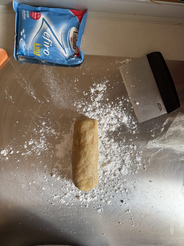 • Para mayor comodidad, con un raspador (preferiblemente de metal), cortar en dos el largo cilindro de masa de Ricciarelli de Siena.