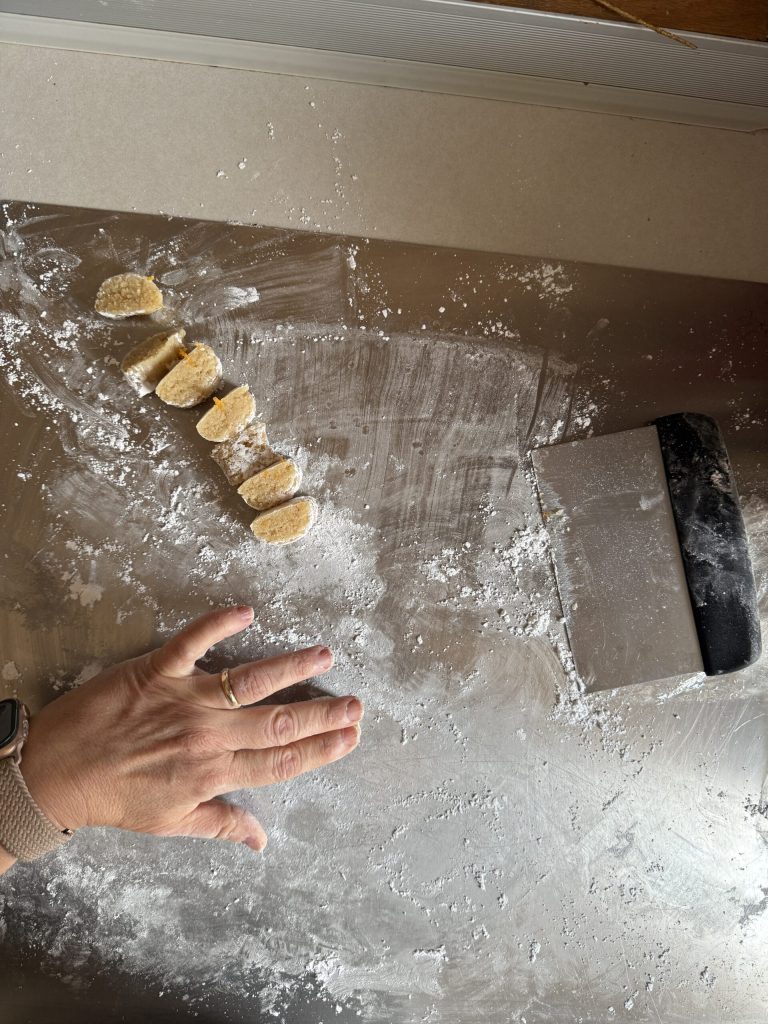 • Cortar todo el medio cilindro de masa de Ricciarelli de Siena, preparando los trozos para dedicarse luego a la formación.