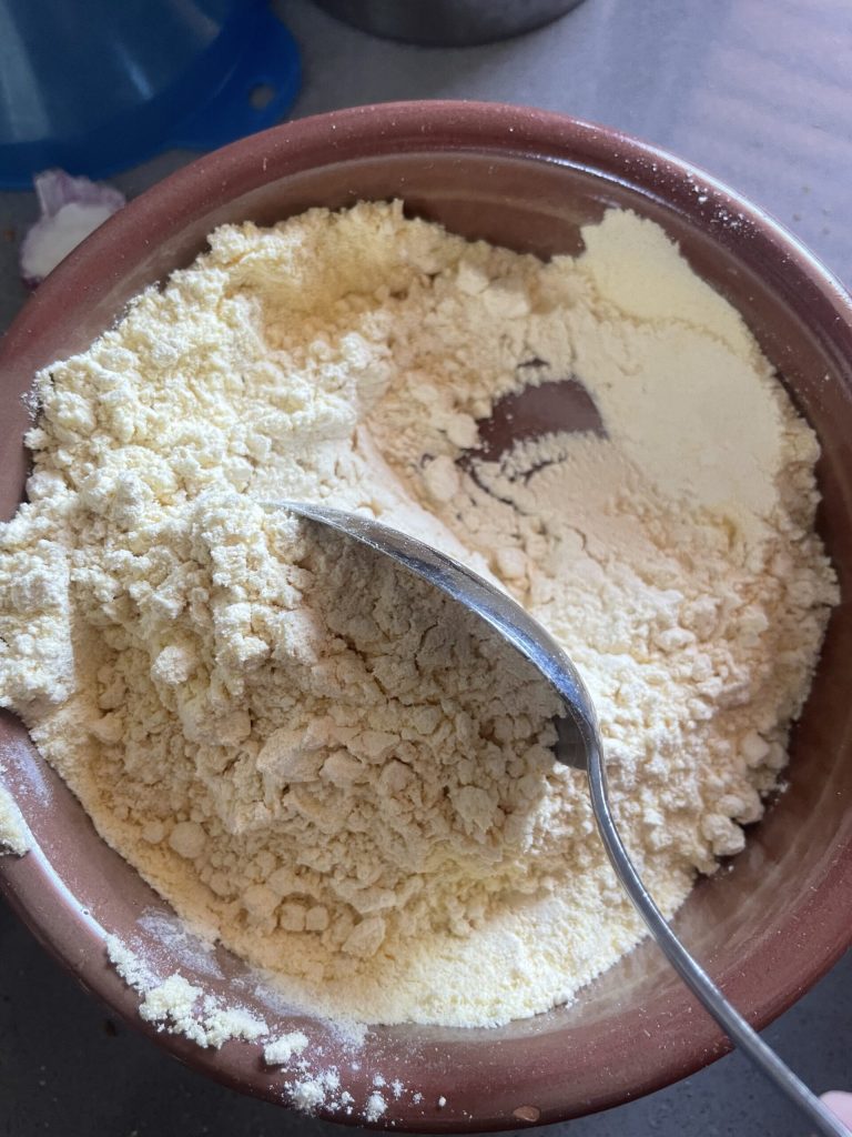 Mientras tanto, en un tazón unir las harinas escogidas. Yo he usado la harina de garbanzos y el maíz fioretto para un toque más granulado y crujiente, pero la elección es muy amplia, como veremos luego!