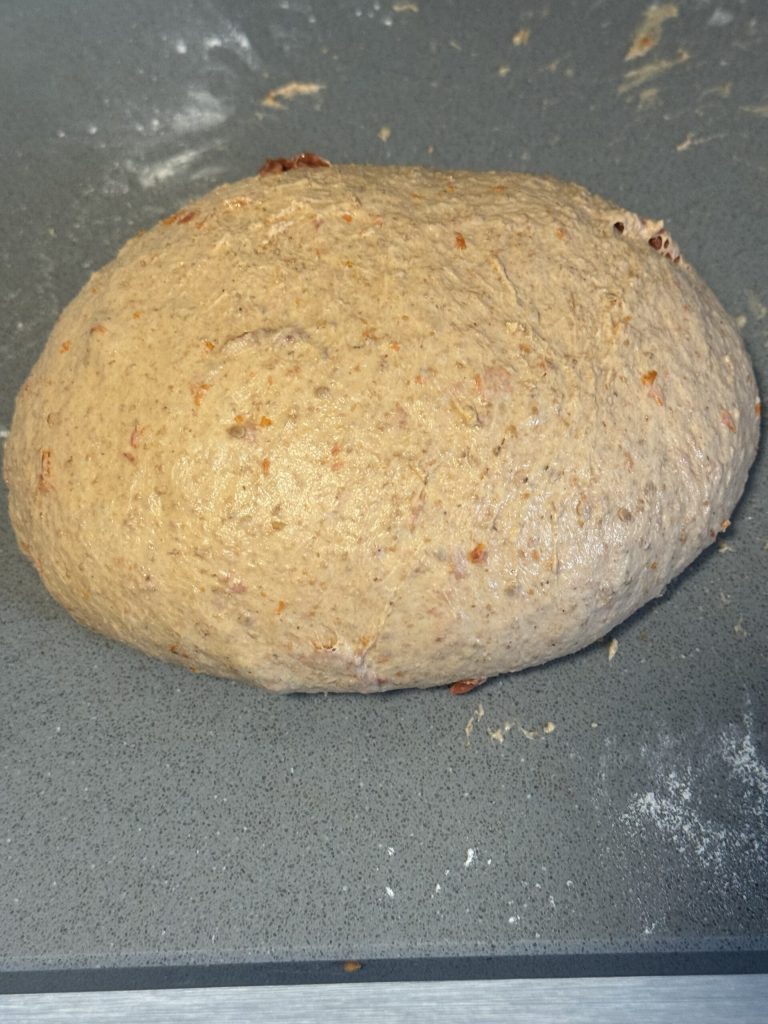 Volver a poner la masa en el tazón de la amasadora y añadir los tomates secos. Mezclar hasta obtener una masa compacta y lisa.