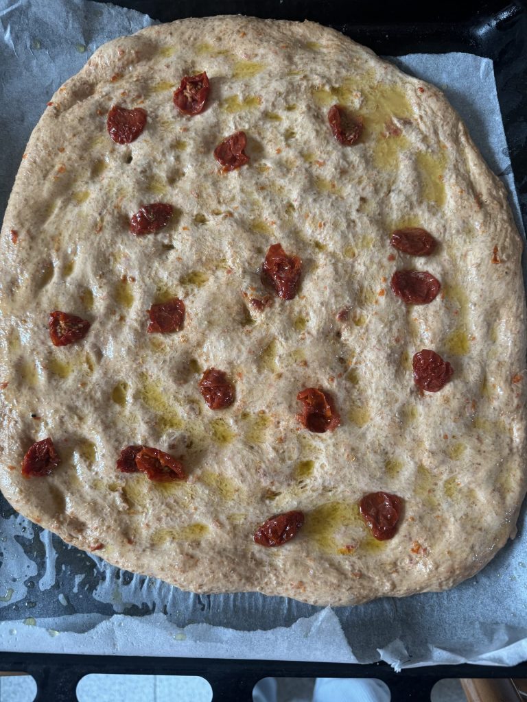 Dejar reposar la schiacciata integral con tomates secos mientras el horno, encendido en modo estático, alcanza los 220 grados.