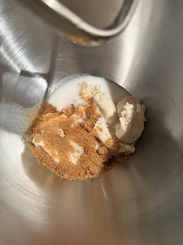 • En la amasadora, usando la pala plana, desmenuza la masa madre previamente refrescada y duplicada. Añade 80 g de líquidos: yo prefiero mezclar agua y bebida de almendra por comodidad, pero también puedes usar sólo agua. Mezcla brevemente para amalgamar.