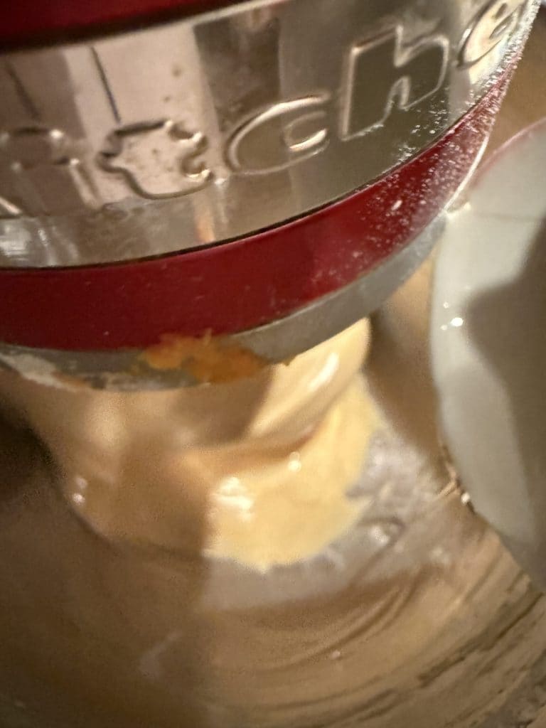 • Al final de la incorporación de líquidos y harinas, la masa deberá presentarse aún cruda, pero ya capaz de agarrarse a la pala plana. Esta consistencia indica que puedes proceder con los siguientes pasos del proceso. Como alternativa, se puede intentar agregar harina o líquidos según el problema encontrado.