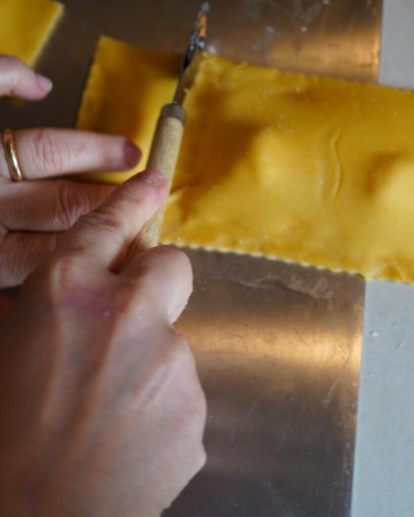 • Con la rueda cortar los tortelli formando grandes cuadrados.