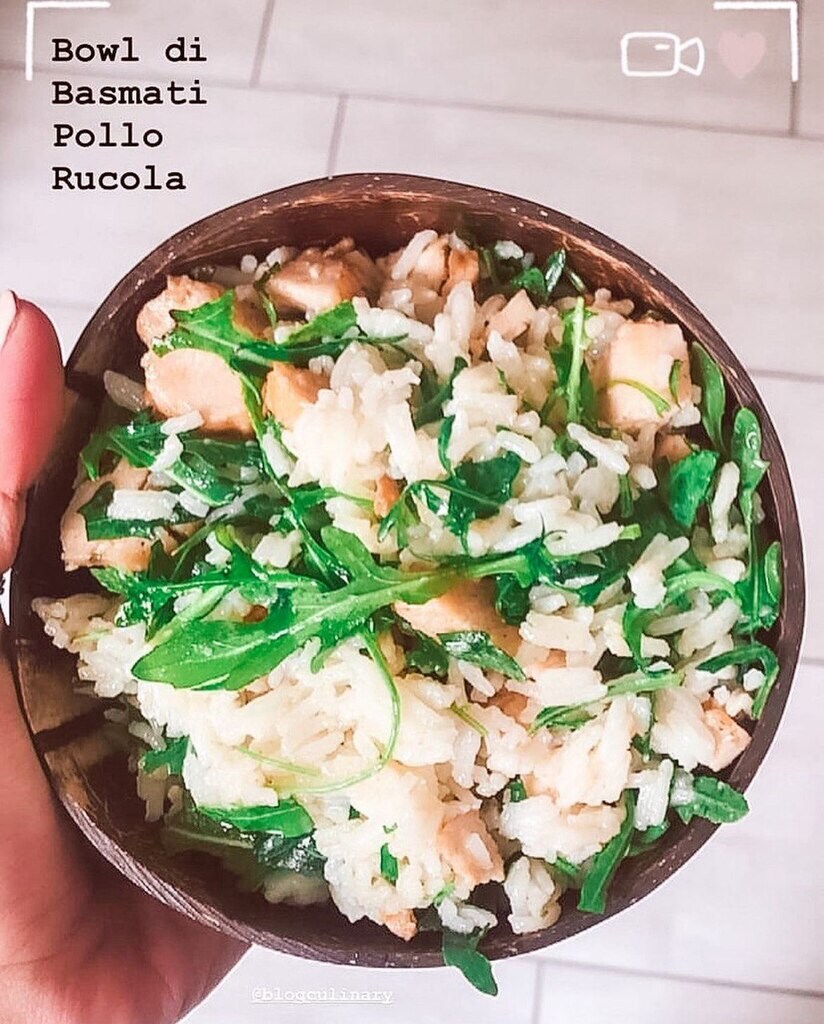 Añadimos la cúrcuma, los garbanzos en lata y los tomatitos. Condimentamos con sal y aceite de oliva virgen extra y albahaca, si lo preferimos.Mientras cocemos el arroz basmati, cortamos en tiras la pechuga de pollo y la cocemos en una sartén con un poco de aceite, o la asamos a la parrilla. Componemos la ensalada poniendo el arroz, el pollo, la rúcula picada con el cuchillo, sal y aceite.